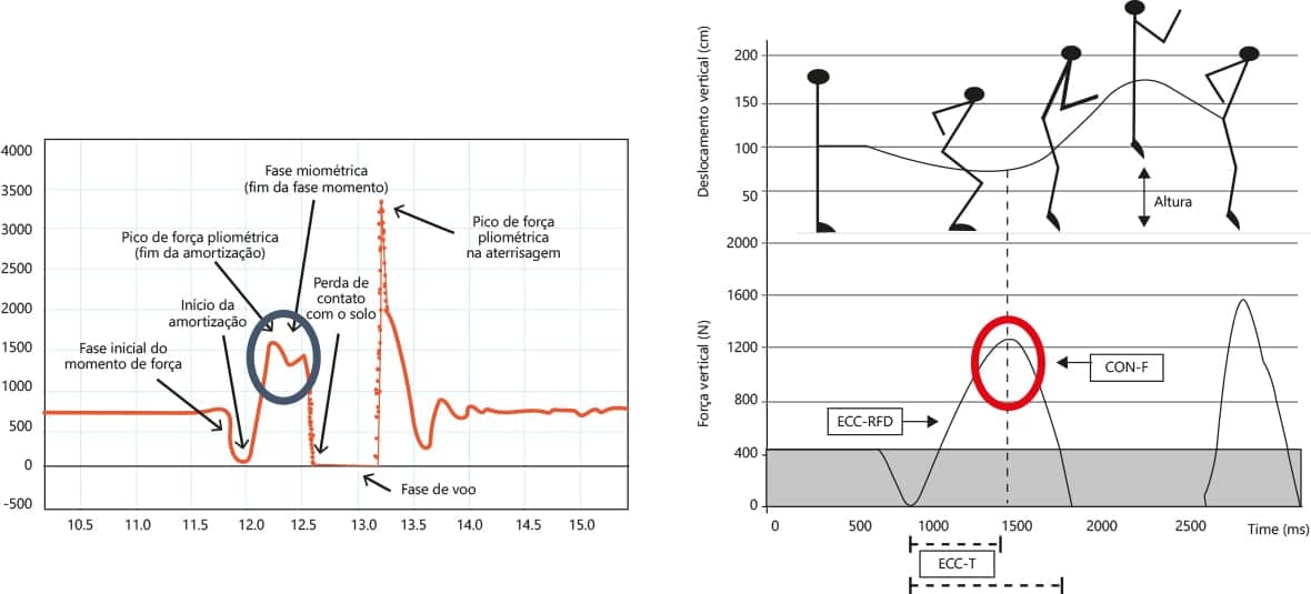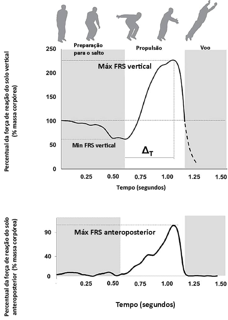 Ao relacionar as variáveis força e tempo, mensurando o tempo entre a força de reação do solo vertical mínima e máxima, pode-se analisar a capacidade de aumentar a força para atingir o valor máximo, conhecido também como taxa de variação de força. Quanto menor for o tempo entre a força mínima e a máxima, maior será a taxa de produção de força e a potência muscular. No ponto em que os pés perdem contato com o solo e se inicia a fase de voo, a força de reação do solo vertical tende a diminuir drasticamente até chegar a zero.