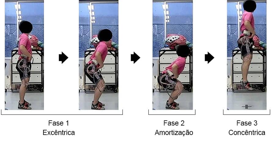 Fase 1 – Ao subir na plataforma de força para realizar o salto, a força de reação do solo é igual à força peso. No momento em que se inicia a flexão de quadril e joelhos e a dorsiflexão, durante a fase excêntrica, a força de reação do solo decai, devido à diminuição da força peso, movimento conhecido como descendente. Nesta fase, o objetivo é mover o corpo para baixo o mais veloz possível para potencializar o ciclo alongamento-encurtamento.