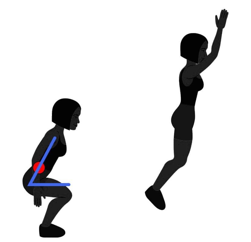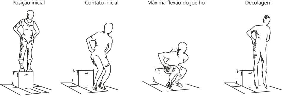 A partir da postura agachada, estágio caracterizado pela posição do corpo na fase de propulsão (salto contramovimento e drop jump) e na fase inicial do salto em agachamento, os três tipos de saltos passam a apresentar as mesmas características cinemáticas.
