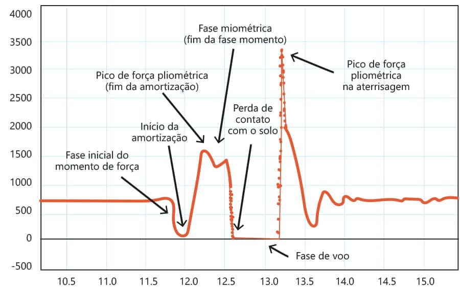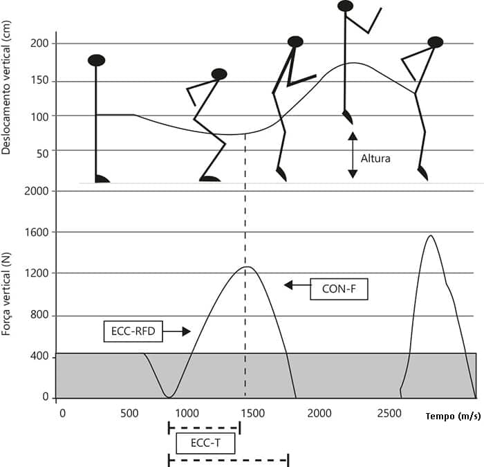 Como pode ser visto na imagem a seguir, essa fase excêntrica dos músculos extensores de quadril e joelho com o movimento dos braços promoverá uma redução da força de reação do solo vertical, podendo chegar a valores próximos à metade da massa corpórea.