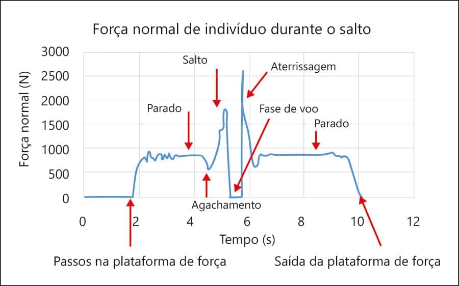 Como destacado, o drop jump é iniciado a partir de uma altura acima (ex.: uma caixa ou um banco) do local (ex.: a plataforma de força) onde será realizado o salto. A fase de descida da caixa promove o movimento descendente do corpo, que, ao entrar em contato com a plataforma de força, promove o primeiro pico de força, definido como pico de força de reação do solo da primeira aterrissagem.