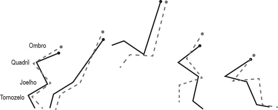 Para entender quantitativamente como as articulações do tronco e do membro inferior se comportam durante todas as fases do salto horizontal, podemos observar o exemplo a seguir, sobre a configuração corporal média de atletas de vôlei.