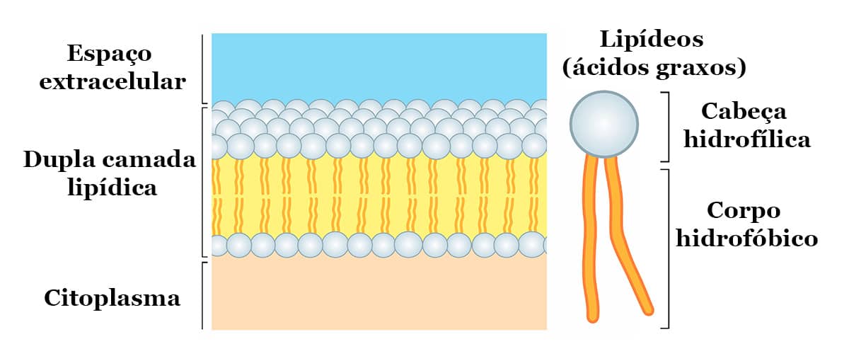 Outro grupo de lipídeos muito importante são os lipídeos estruturais em membranas, responsáveis por manter a arquitetura estrutural das membranas biológicas. Eles são estruturados por uma dupla camada lipídica, atuando como barreira para a passagem de moléculas polares e íons. São anfipáticos, ou seja, possuem uma cabeça polar (hidrofílica) e um corpo apolar (hidrofóbico). Os fosfolipídeos (figura 2) são os principais componentes desse grupo; no entanto, existem outros exemplos de lipídeos, como: glicerofosfolipídeos, esfingolipídeos, galactolipídeos e sulfolipídeos.