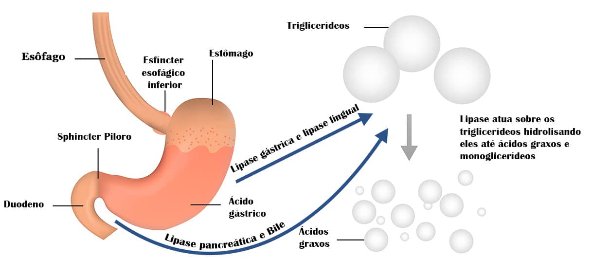 O metabolismo deles é feito principalmente no fígado, como pode ser visto na figura 3, mas sua digestão começa no estômago, cujo pH ácido permite que a enzima lipase gástrica e a lipase lingual entrem em ação, quebrando as ligações ésteres presentes nos ácidos graxos de cadeia curta. Mas a real ação no estômago sobre a digestão dos lipídeos se dá pela emulsificação deles resultante dos movimentos peristálticos – onde é feita sua dispersão de forma equivalente no bolo alimentar.
