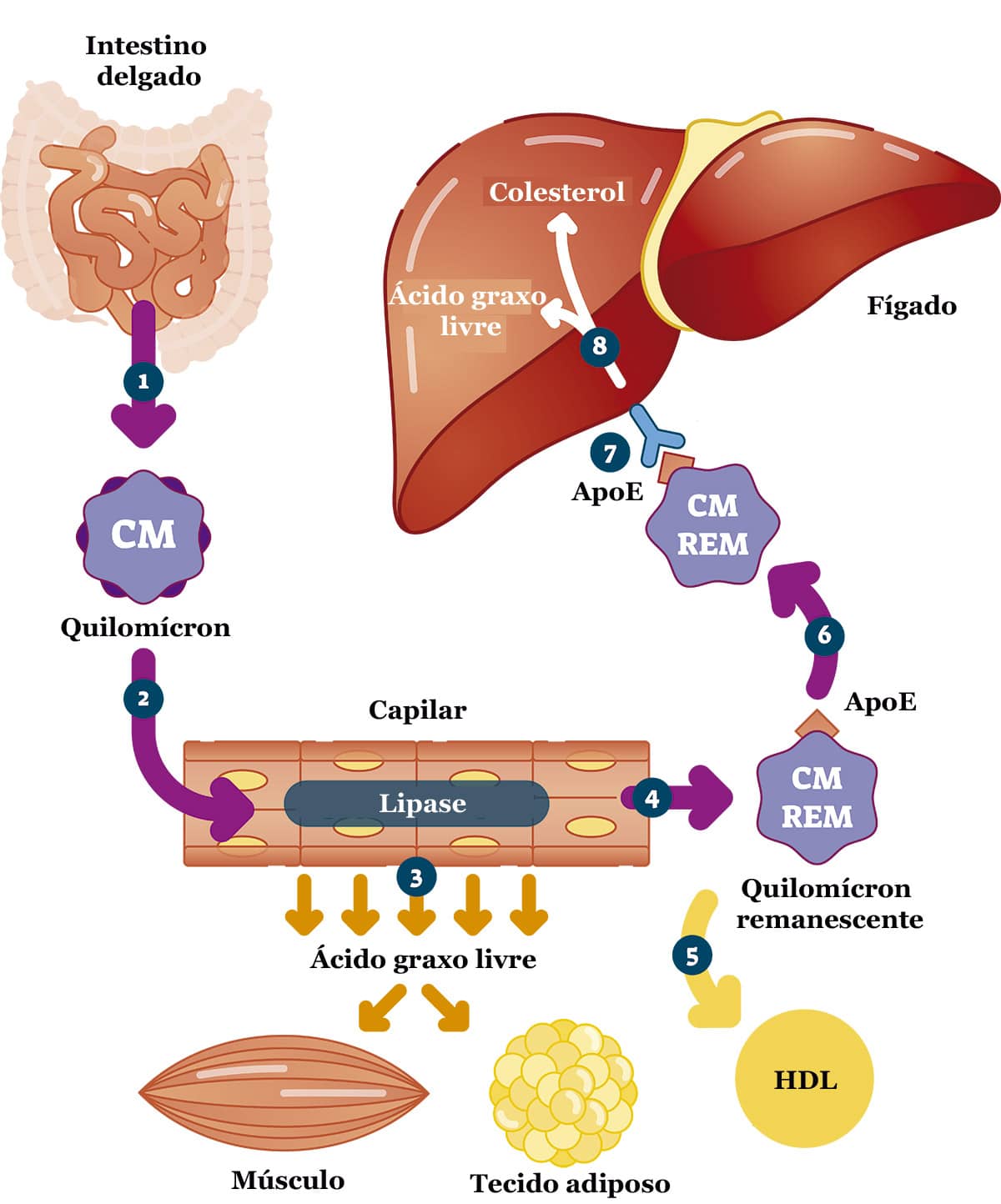 Diferentemente da glicose, o triacilglicerol dos quilomícrons é metabolizado pelas lipoproteínas lipases nos tecidos, o que permite a incorporação de lipídeos aos tecidos ou a sua oxidação, transformando-os em fonte energética. Ao sofrer metabolização, o quilomícron passa para a sua forma remanescente, que é metabolizada pelo fígado, como vimos na figura 3. Durante a metabolização no fígado, a lipase hepática atua tanto para facilitar a captação de remanescentes quanto para hidrolisá-los, transformando, por exemplo, a lipoproteína VLDL em LDL.