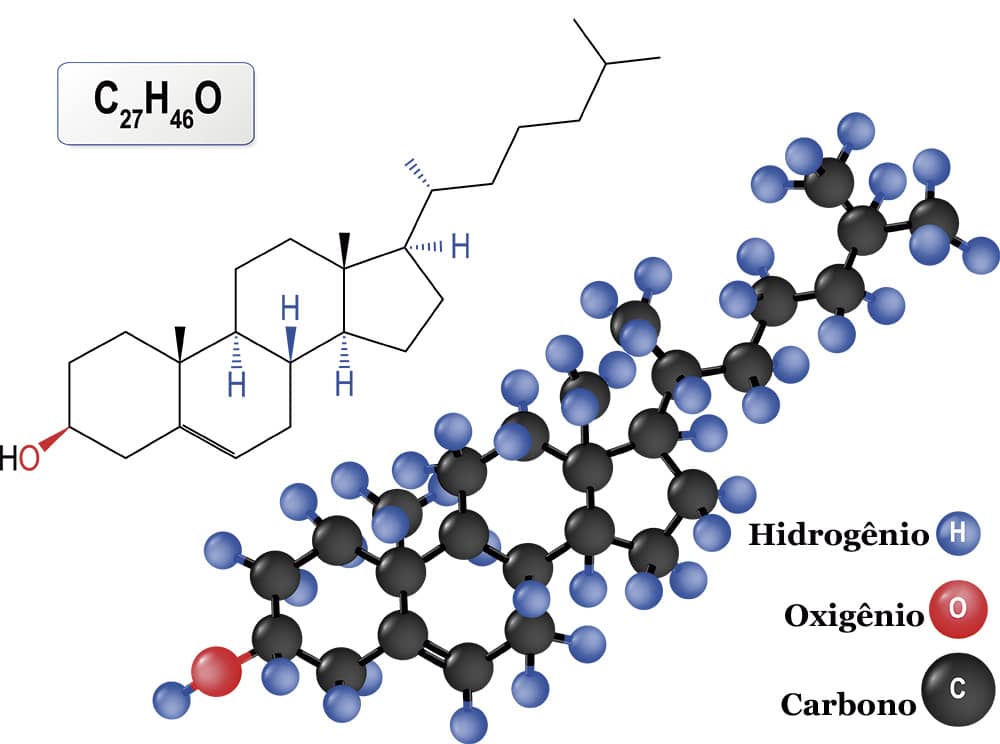 O colesterol é formado por 27 átomos de carbono, 46 átomos de hidrogênio e um átomo de oxigênio (veja sua estrutura na figura 5). Além de ser fonte energia, o colesterol é essencial na produção de sais biliares, na composição da membrana celular, e na produção de hormônios e vitamina D.