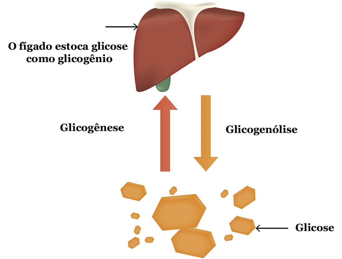 A glicose também pode ser armazenada após a sua conversão em glicogênio, com a reação de glicogênese. O glicogênio é um carboidrato (polissacarídeo) endógeno formado por subunidades de glicose ligadas de forma linear e por ramificações. É encontrado em grande quantidade no músculo esquelético e no fígado, e em situações de jejum. A sua quebra fornece glicose, mantendo os níveis normais dessa substância no sangue.