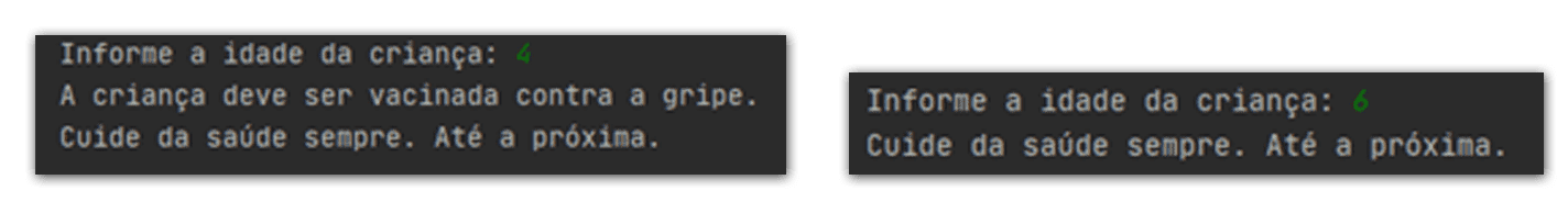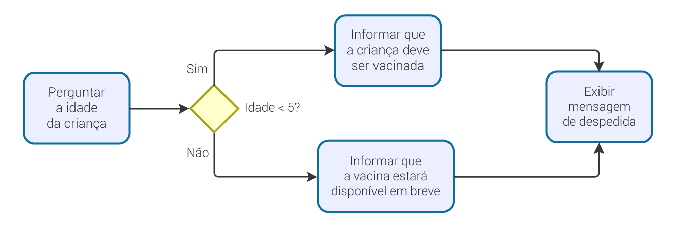 - Caso a segunda condição seja falsa (idade maior que 5), a informação é “a vacinação só ocorrerá daqui a 3 meses”;