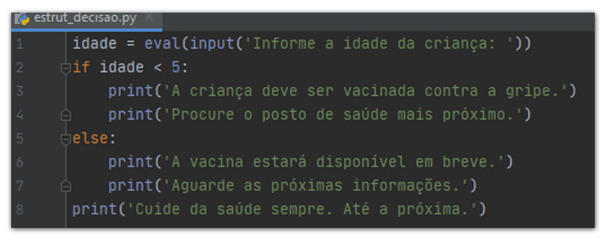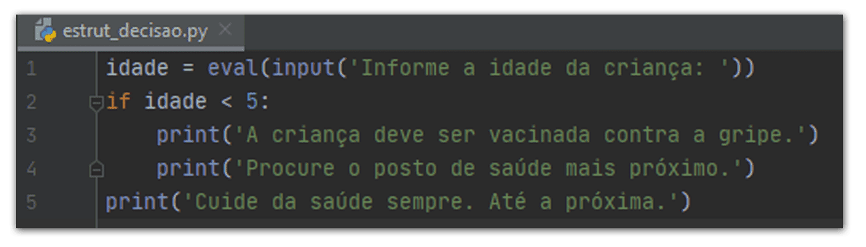No exemplo acima, as linhas 3 e 4 estão dentro do if e só serão executadas caso a condição (idade < 5) seja verdadeira.
