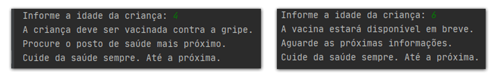 - Caso a segunda condição seja verdadeira (idade igual a 5), a informação é “a vacina estará disponível em breve”;