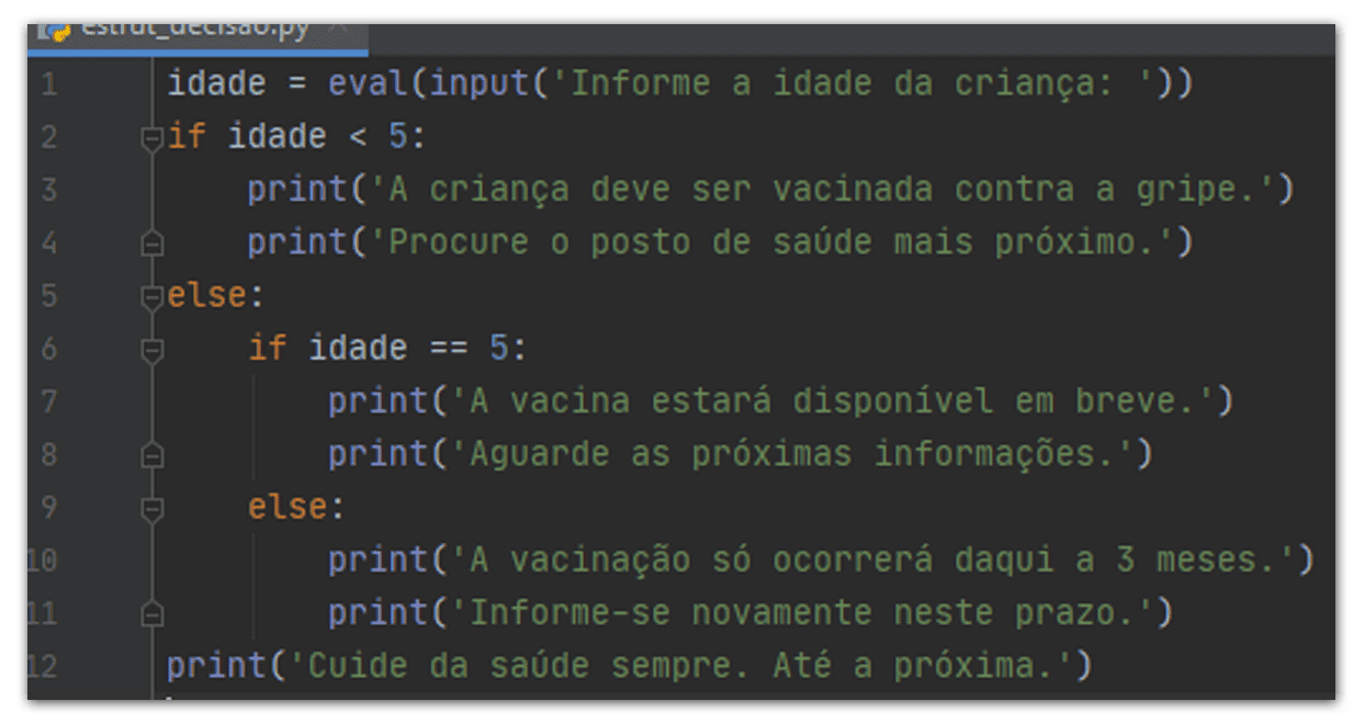 if <condição 1>:Bloco de código que será executado caso condição seja Trueelif <condição 2>:Bloco de código que será executado caso condição 1 seja False e condição 2 seja Trueelse:Bloco de código que será executado caso condição 1 seja False e condição 2 seja FalseInstrução fora do ifVeja uma implementação possível com a estrutura elif: