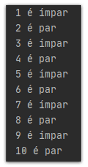 Assim, podemos concentrar as instruções no caso em que a condição seja falsa. Suponha que queiramos imprimir somente os números ímpares entre 1 e 10. Uma implementação possível é: