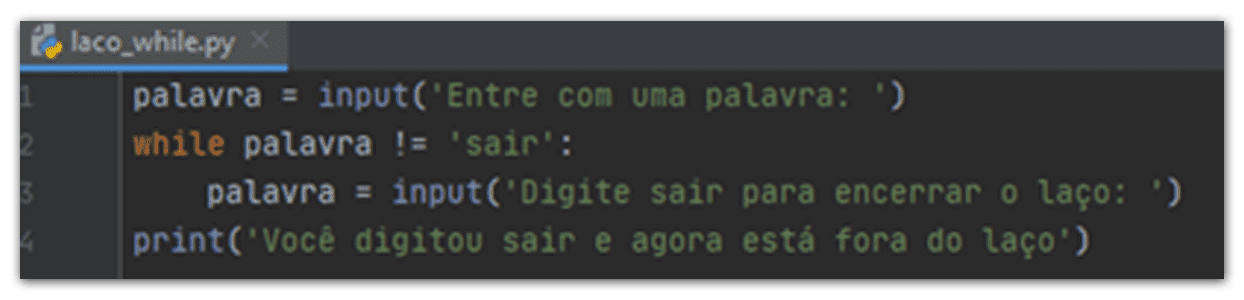 - A linha 3 será repetida enquanto a condição for verdadeira, ou seja, enquanto o valor da variável palavra for diferente de ‘sair’. Quando o valor da variável palavra for igual a ‘sair’, a condição do laço while será falsa e o laço será encerrado;