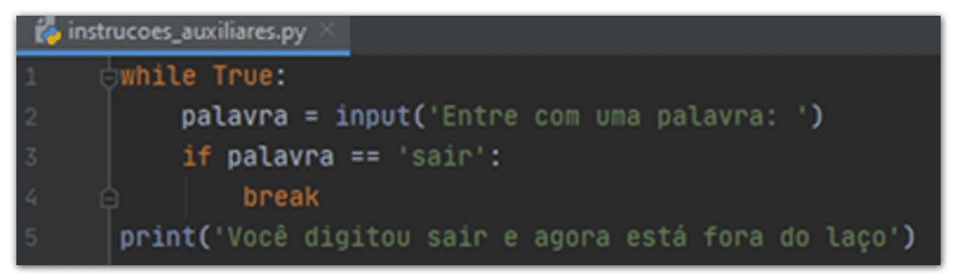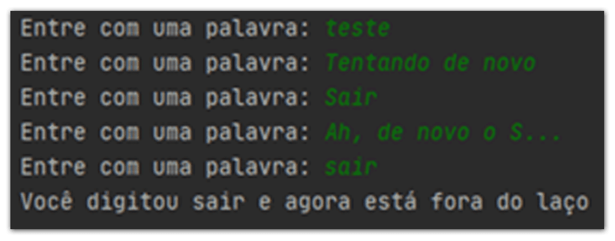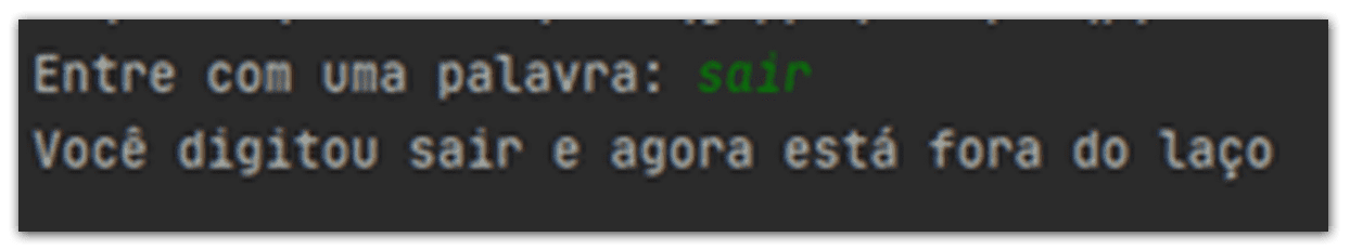 - Na linha 3, testamos se a palavra é igual a ‘sair’. Se o teste for verdadeiro, será executada a linha 4, onde está o break. Ou seja, o laço criado na linha 1 será encerrado;