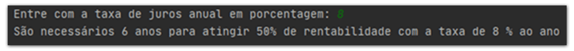 Considere que queremos saber depois de quantos anos uma aplicação, com juros anuais informados pelo usuário, terá atingido 50% de rendimento sobre o valor aplicado inicialmente. Ou seja, se a aplicação inicial foi de R$1.000,00, quantos anos serão necessários para atingir o valor de R$1.500,00?