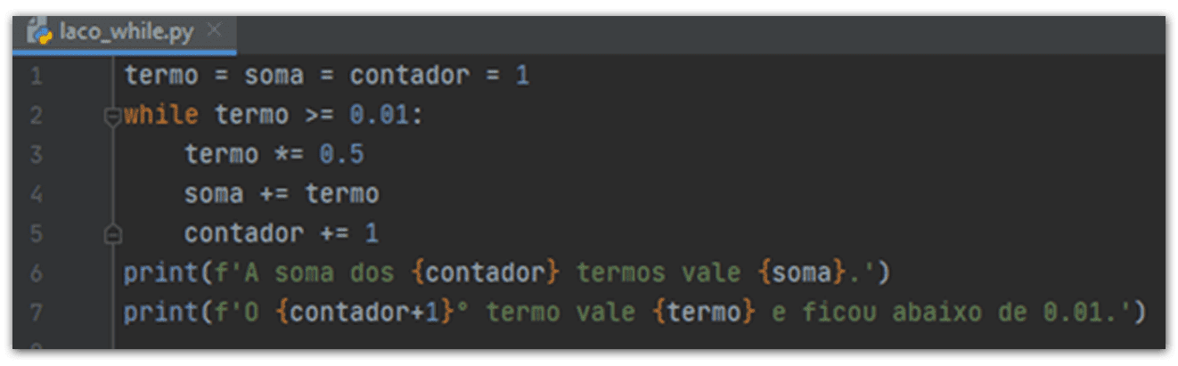 - As linhas 3, 4 e 5 serão repetidas enquanto a condição for verdadeira, ou seja, o valor da variável termo for maior ou igual a 0,01. Quando o valor da variável termo for menor que 0,01, a condição do laço while será falsa e o laço será encerrado;