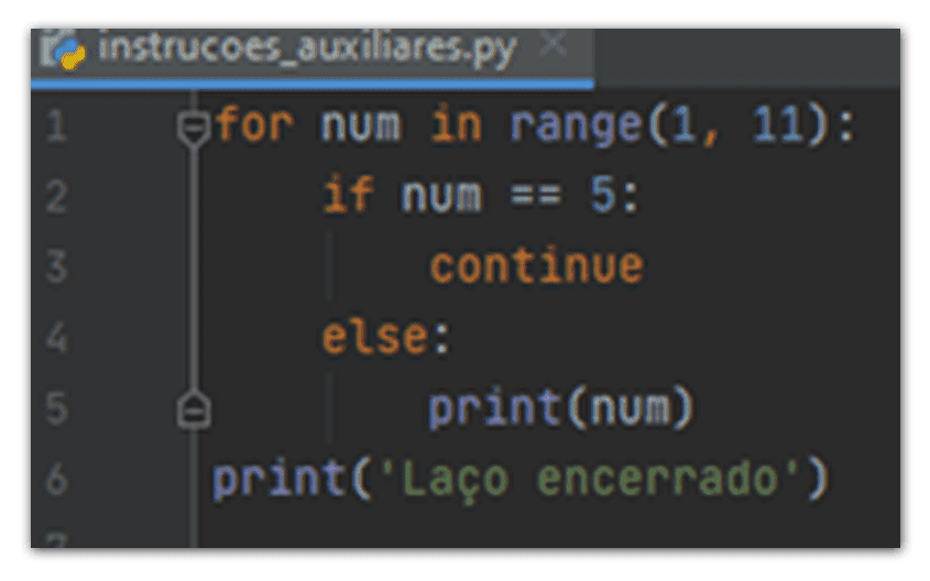 O exemplo a seguir imprime todos os números inteiros, de 1 até 10, pulando apenas o 5. Veja uma implementação:
