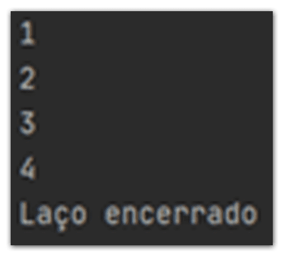 - Somente após a saída do laço será executada a linha 5, que representa a impressão da mensagem de saída do laço ao usuário.