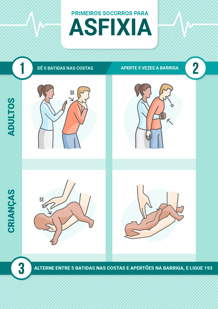Muitas vezes, quando um adulto ou uma criança se engasga e tosse, é comum encontrar quem bata nas costas para ajudar, mas isso não é suficiente para resolver o problema. Pode, inclusive, ser muito grave, porque facilita a aspiração daquilo que causou o engasgo. O correto é realizar a manobra de Heimlich, demonstrada na imagem.