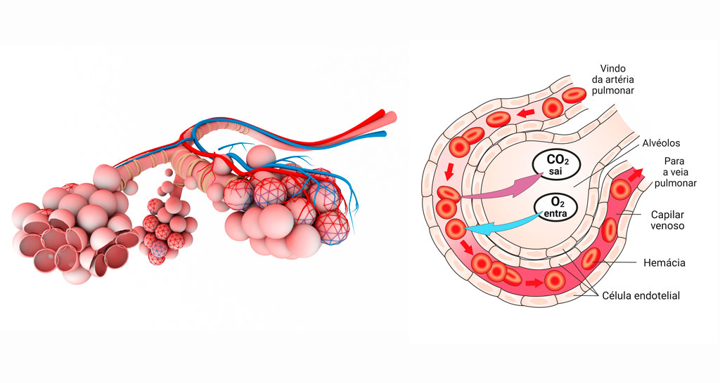 Através dessa rede de capilares arteriais e venosos, o sangue que chega aos pulmões, rico em CO2, sofre o processo de hematose e deixa os pulmões como sangue oxigenado, ou seja, rico em O2.