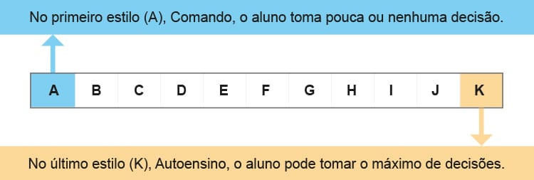 Mosston e Ashworth (2008) sugerem um exemplo de combinação racional desses dois modelos metodológicos. Apresentam uma organização dos diferentes métodos (que chamam de estilos de ensino), de forma integrada e contínua, em uma sequência lógica que vai da dependência do aluno em relação ao professor para a independência do aluno. Os autores denominaram a sua proposta de “O Espectro dos Estilos de Ensino”, mais conhecida no Brasil como os Estilos de Ensino de Mosston.