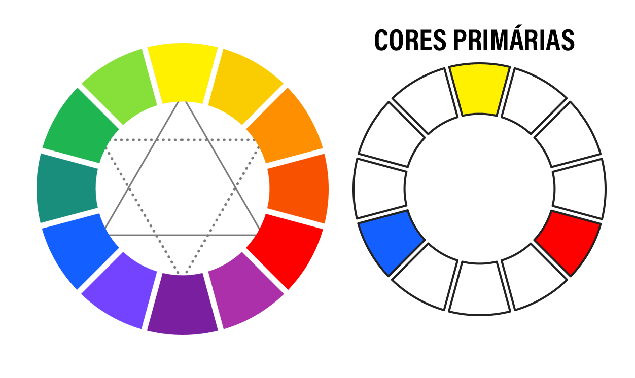 As cores primárias são identificadas como: azul, vermelho e amarelo.