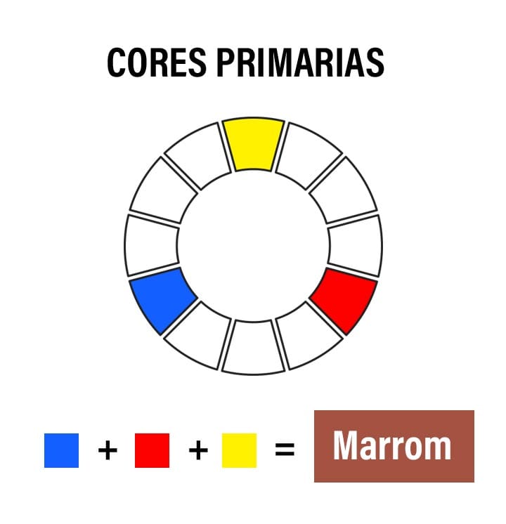 Na mistura das primárias em partes iguais, percebe-se o aparecimento da cor marrom, que pode, dependendo do desequilíbrio nas partes das cores misturadas entre si, variar de uma tonalidade mais escura para outra mais clara.