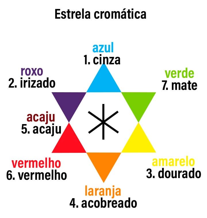 Da estrela cromática são extraídas as nuances de reflexos obtidas pelas reflexões de luminosidade dos pigmentos contidos nas cores primárias, secundárias e uma terciária: o acaju (mistura entre azul e laranja).