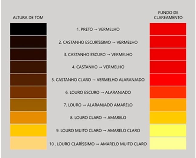 Essas cores de fundo de clareamento são ocultas, pois só estarão visíveis quando o cabelo sofrer algum tipo de clareamento – seja ele natural ou artificial. Nesse processo, a fibra capilar perde desde os pigmentos azuis até os vermelhos. Em seguida, é a vez dos alaranjados, restando apenas os amarelos bem claros.